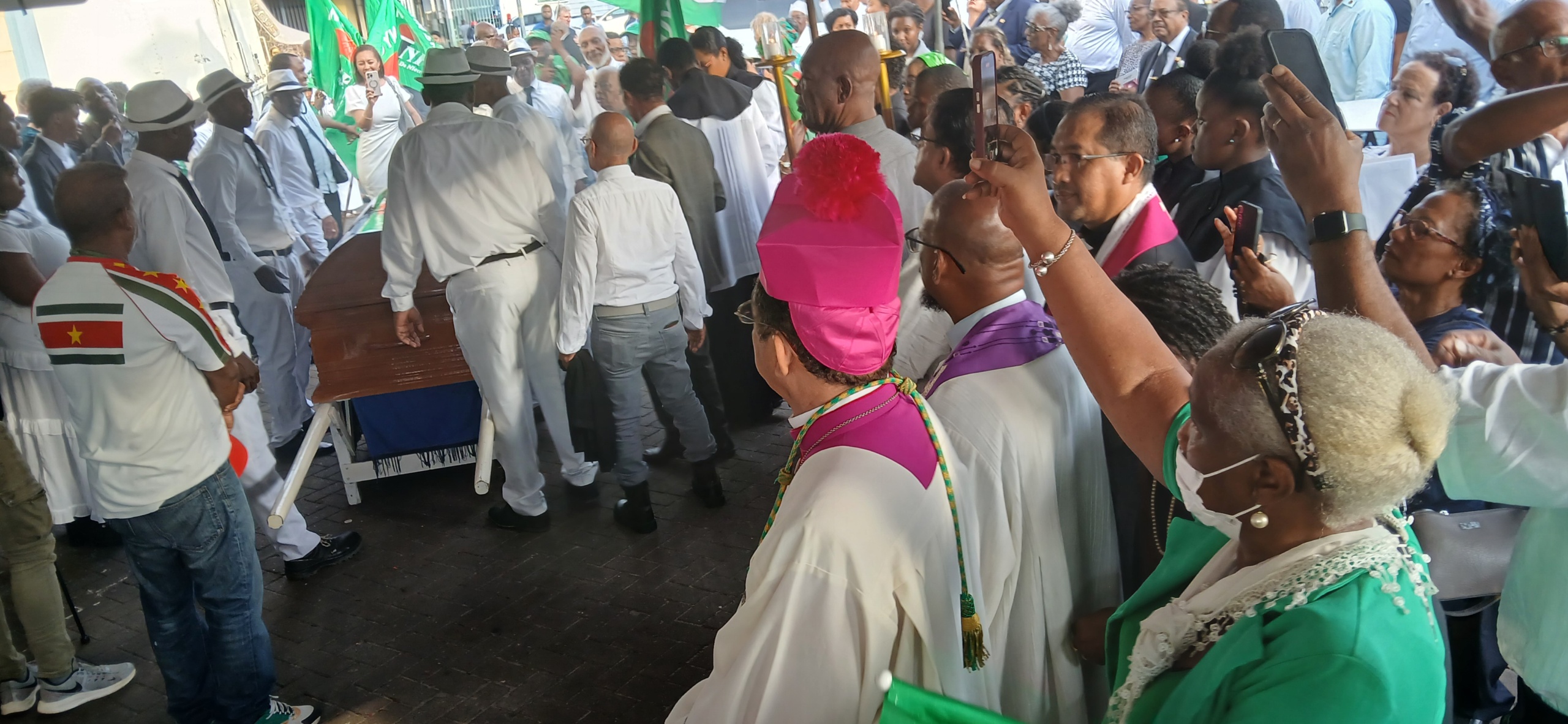 Monseigneur Karel Choennie leidt het kerkelijk ritueel. Esteban Kross ondersteund — het licht van eeuwige rust. Dan zingt Sandra Hoodhoop: “Mijn Jezus, ik hou van U.” Haar stem snijdt zuiver door de stilte..