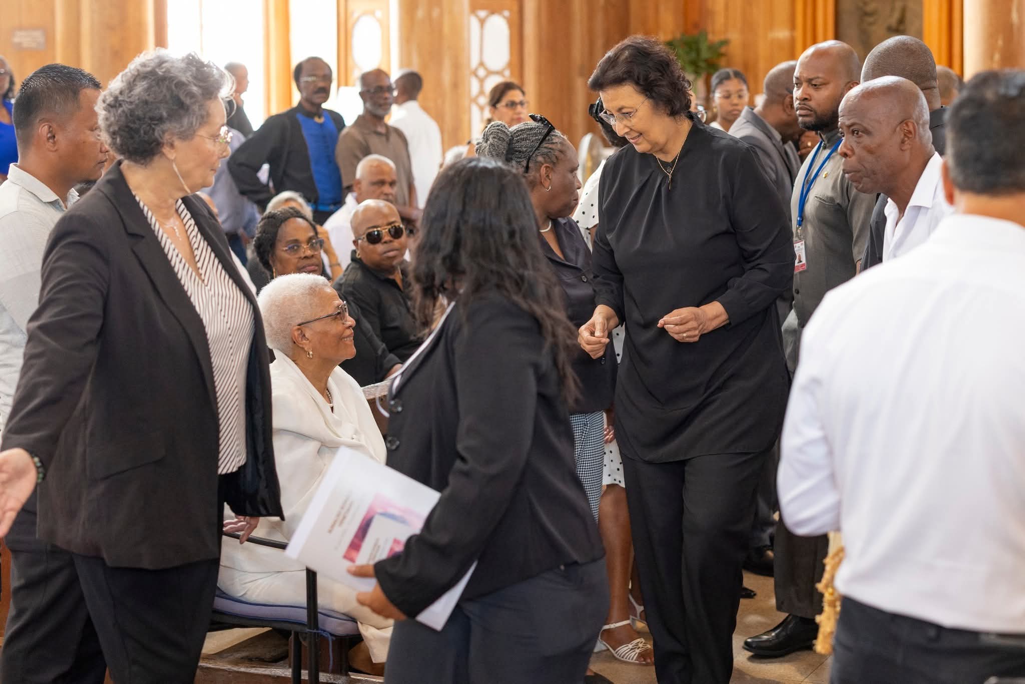 Terwijl president Jenny Simons, ambassadeurs, vicepresident en ex-vice president en voormalige coalitiepartners binnendruppelen, zit weduwe Liesbeth Venetiaan met haar kinderen en kleinkinderen op de voorste rij in de St Petrus en Paulus Kathedrale Basiliek. Op de voorzijde zitten ook kopstukken van de Nationale Partij Suriname (NPS), onder wie partijvoorzitter en vicepresident Gregory Rusland, en DNA-leden Dorothy Hoever en Ivanildo Plein, leden van de partij die Venetiaan drie keer tot president heeft gemaakt.