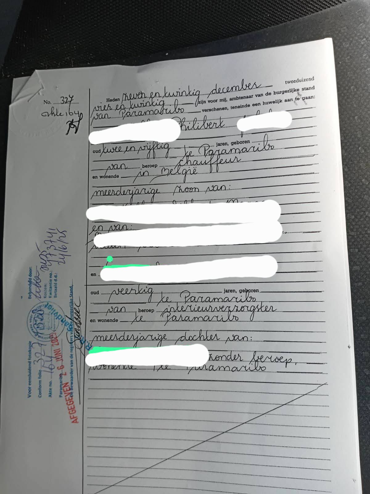 Huwelijksakte Vanessa L en Philibert Van K