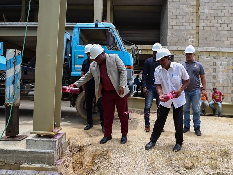 Met zichtbaar enthousiasme plaatsten DNA-voorzitter Marinus Bee en commissievoorzitter Mahinderkoemar Jogi symbolisch woensdag de stalen kolommen en balken aan de buitenzijde van de nieuwe vergaderzaal van De Nationale Assemblee. Die vormen straks het stevige skelet van het dak en de muren. De bouw wordt uitgevoerd door Janki Construction N.V., dat verwacht binnen zes maanden het project af te ronden. Projectleider Anil Kisson: “De ruwbouw is bijna klaar. We zijn in 2023 begonnen, liepen wat vertraging op, maar nu loopt alles op volle toeren.”