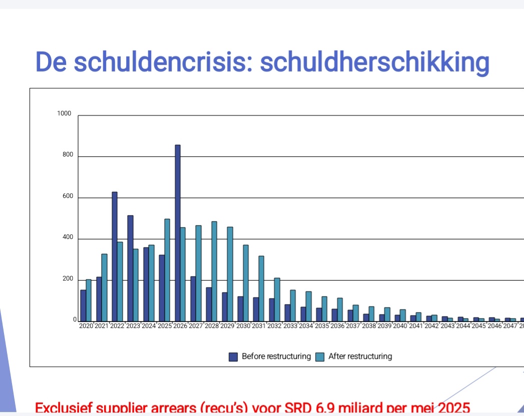 Deze bedragen zijn exclusief een schuld van SRD 6,9 miljard aan leveranciers (supplier arrears), waarvoor nog geen aflossingsplan is gepresenteerd