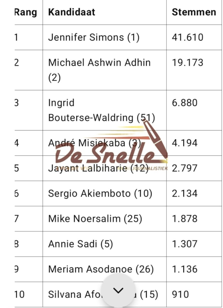 Deze top vijf is goed  voor bijna 88% van alle stemmen op de lijst. Jennifer Simons – 41.610, Ashwin Adhin – 19.173, Ingrid Bouterse-Waldring – 6.880, André Misiekaba – 4.194 en Jayant Lalbiharie – 2.797