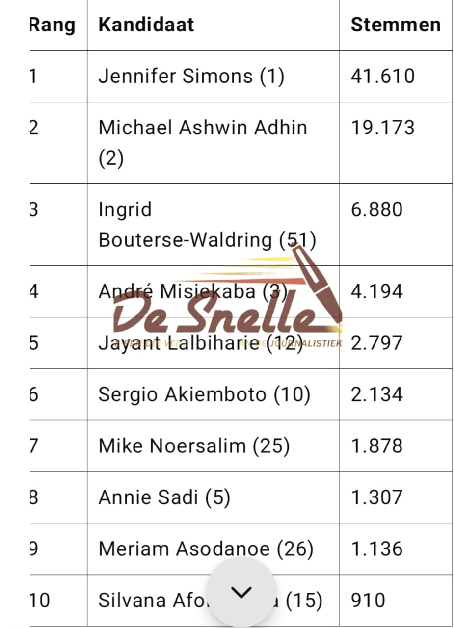 Op de tweede plaats eindigde voormalig vicepresident Adhin met 19.173 stemmen, gevolgd door Bouterse-Waldring, de weduwe van oud-president Desi Bouterse, met 6.880 stemmen.