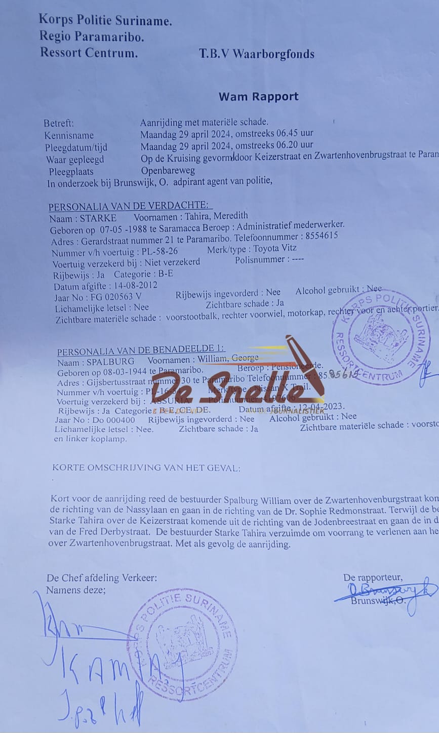William Spalburg (81) is machteloos en radeloos. Een rechtszaak met een vonnis en een veroordeling, brieven aan de procureur-generaal en de minister van Justitie en Politie. De politie, de verzekering en het Waarborgfonds plat gelopen: geen van deze instanties heeft hem tot nu toe kunnen helpen. De schade die Spalburg opliep na een aanrijding veroorzaakt door Tahira Starke is inmiddels opgelopen tot SRD 139.000. De veroorzaker is intussen verstek veroordeeld, maar is nergens te vinden.